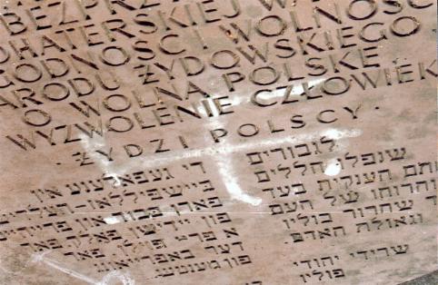 And still... a memorial stone, engraved in Polish and Hebrew, sitting in the sun for all to see: it is embellished with a crude swastika, and no-one has bothered to remove it.